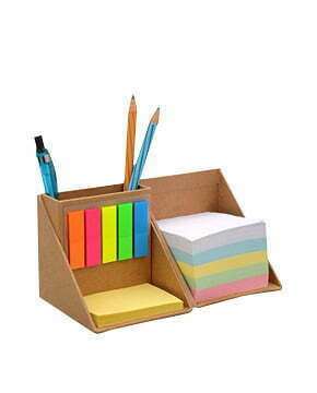Very functional design, folds to save space – Excellent branding area on 6 sides – Even when open, printing is visible from the back – Contains multi-color memo strips and writing pads – Has an in-built tumbler to store your stationary – Colour Available: Brown